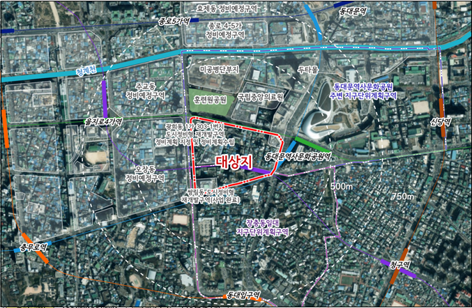 광희동 도시정비형 재개발구역은 을지로, 동호로, 퇴계로, 장충단로로 둘러싸인 지역이다. 서울시는 정비계획에서 을지스타몰(4구역)과 5호선 동대문역사문화공원 지하철역과 이어지도록 지상 공원의 하부에 지하도로(보행전용)을 입체공간구상을 통해 보행 편의성 및 시민 휴게 공간을 강화했다.