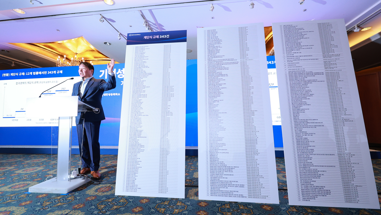 실제로 대한상의와 김영주 부산대 교수 연구팀과 공동 수행한 ‘차등규제 전수조사’ 결과에 따르면 경제 관련 12개 법안에만 343개의 기업별 차등 규제가 있다. 중소기업에서 중견기업이 되는 순간 규제가 94개 늘고, 대기업이 되면 329개까지 확 늘어난다. 최 회장은 343건의 규제가 빼곡하게 적혀 바닥에서 천장까지 길게 늘어진 대형 패널 3장을 직접 보여주기도 했다.