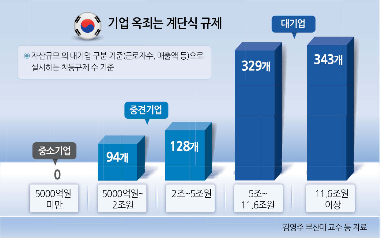 그러나 자산의 증가가 가져다주는 이점보다 규제의 충격이 커지는 것도 바로 이 때부터다. 한국경제인협회에 따르면 중소기업을 졸업하면 적용받는 규제는 57개에서 183개로 3배 가까이 늘어나고, 중견기업을 벗어나면 209개에서 274개로 40% 증가한다.