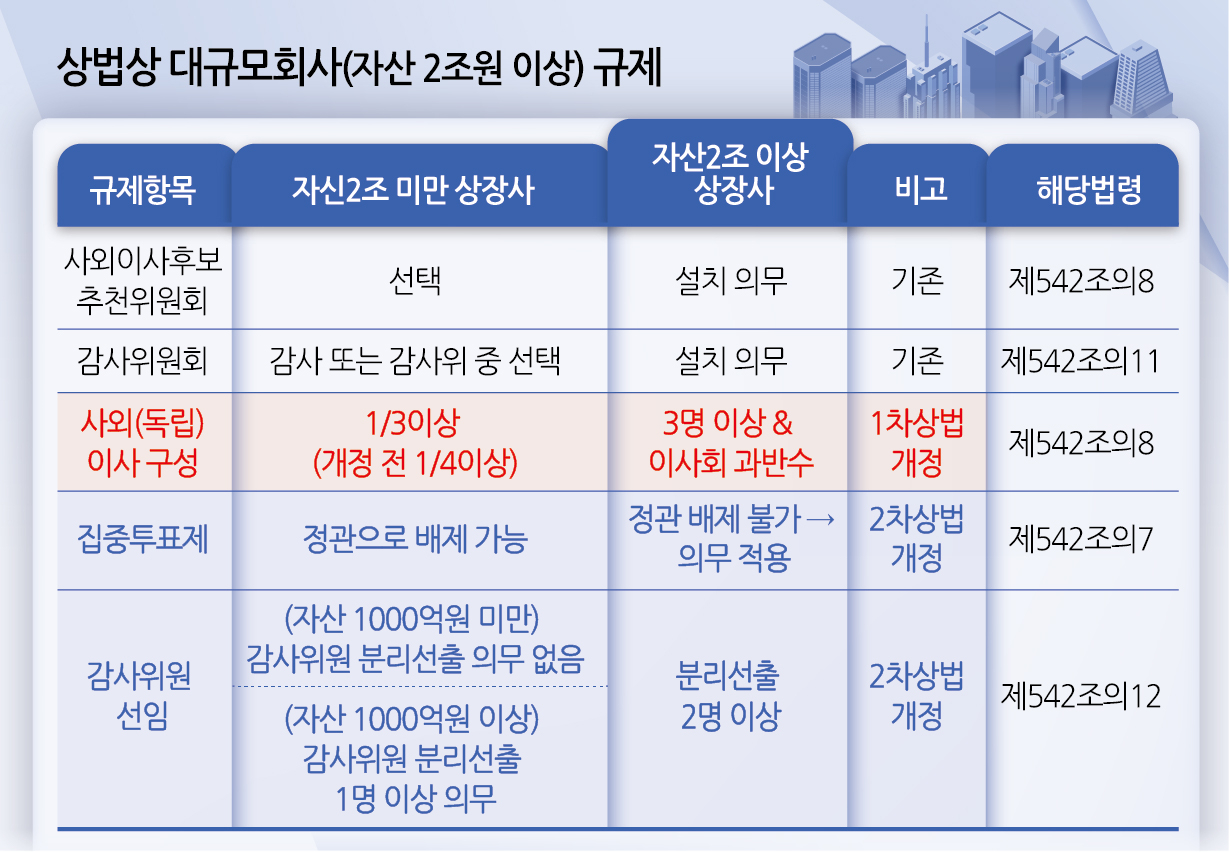 상법에 따라 자산총액 2조원 이상 상장회사는 이사회에 사외이사를 3명 이상 둬야 하고, 이사의 과반을 사외이사로 구성해야 한다. 또한, 3명 이상의 감사위원으로 구성된 감사위원회를 반드시 설치하고 감사위원의 3분의 2 이상은 사외이사로 채워야 한다.