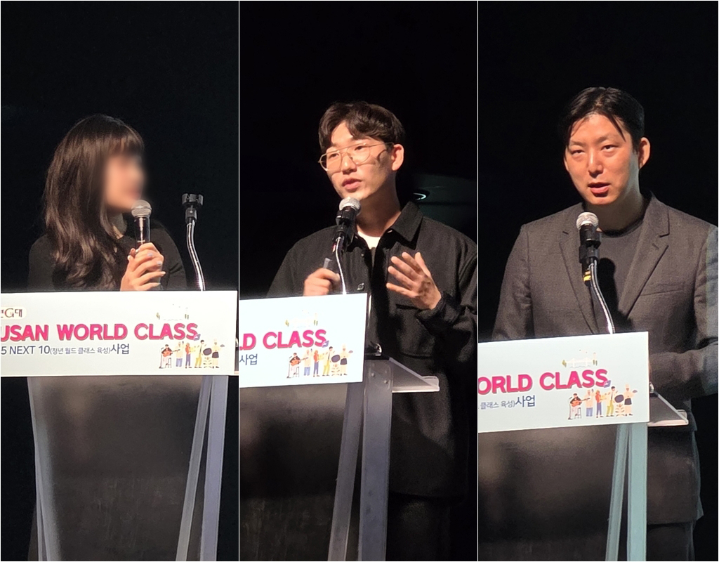 | ‘2025년 청년 월드클래스 육성사업’ 대상자 선정을 위한 공개심사에서 최종 선정된 청년 3인이 발표를 하고 있는 모습. (사진 왼쪽부터) 김진주 씨, 양승민 씨, 김현준 씨. [부산광역시 제공] |