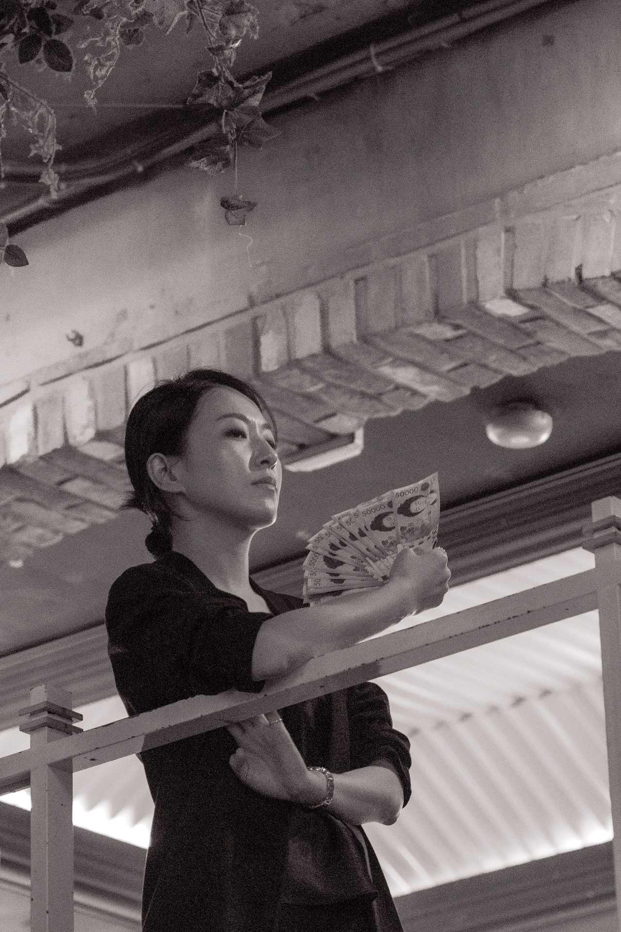 12㎝의 하이힐을 신고, 샤넬 스타일의 투피스를 입고 담배를 손에 쥔 뺑 여사. 침대에 엎드려 돈 세는 게 낙인 욕망의 화신이면서, 누구보다 판세를 빨리 읽는 관찰자이고, 한 번 걸리면 골수까지 뽑아먹고 미련 없이 떠나는 여자다. 무대에선 “1cm의 굽도 허용하지 않는다”는 이소연이 뺑 여사로 분하며 킬힐을 신었다.