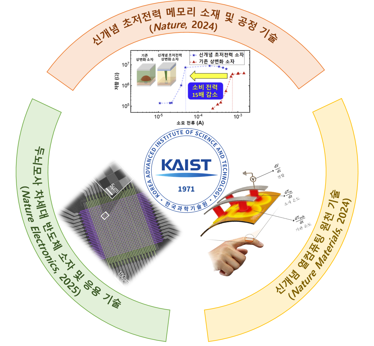 KAIST는 전기및전자공학부, 반도체시스템공학과, 반도체공학대학원 등 교육 프로그램을 운영하며, 뉴로모픽 컴퓨팅, 인-메모리 컴퓨팅, 2차원 신소재 기반 소자 등 차세대 반도체 연구를 선도하고 있다. 이러한 기반 위에서 연구진은 기존 실리콘 한계를 넘어서는 새로운 아키텍처와 소자를 개발하며, 인공지능·로보틱스·의료 등 다양한 응용 분야 혁신을 이끌고 있다.