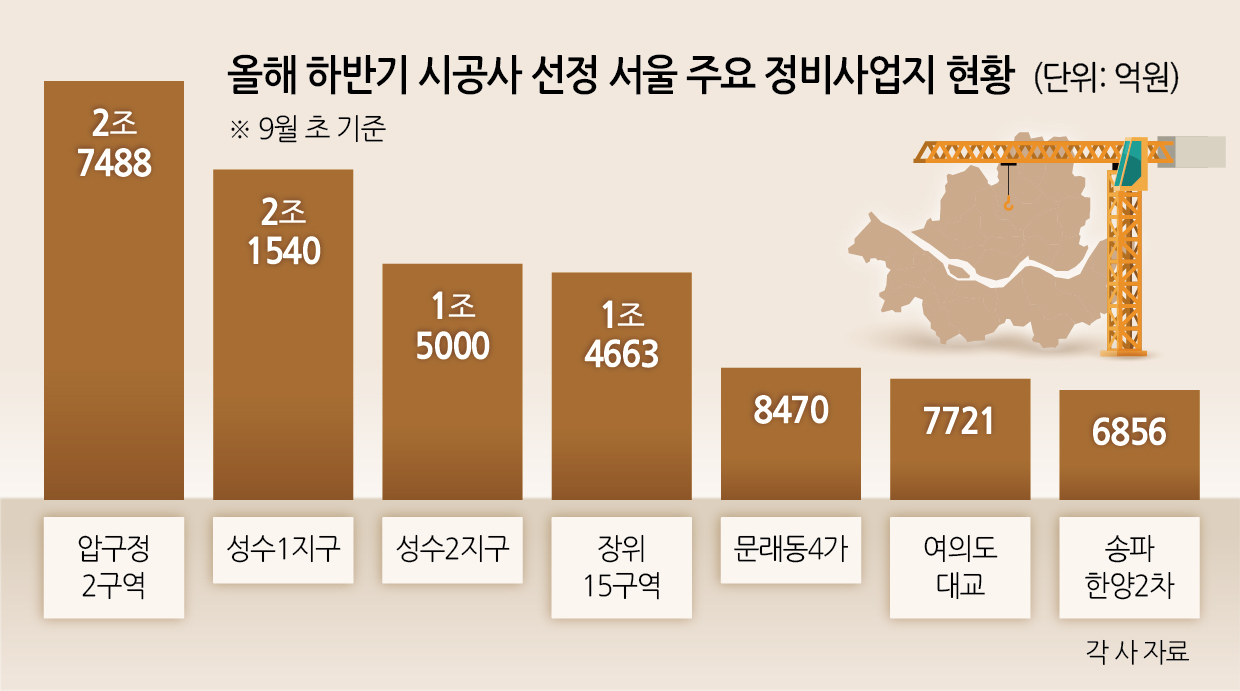 5일 정비업계에 따르면 하반기에 총 10조 규모 수주전이 펼쳐진다. 가장 규모가 큰 강남구 압구정2구역 재건축(2조7488억원)과 성동구 성수1지구(2조1540억원)를 비롯해 성수2지구(1조7846억원), 성북구 장위15구역 재개발(1조4663억원), 은평구 증산4구역 재개발(1조9435억원), 영등포구 문래동4가 재개발(8470억원), 여의도 대교아파트 재건축(7721억원), 송파한양2차(6856억원) 등이 줄줄이 시공사 선정에 나선다.