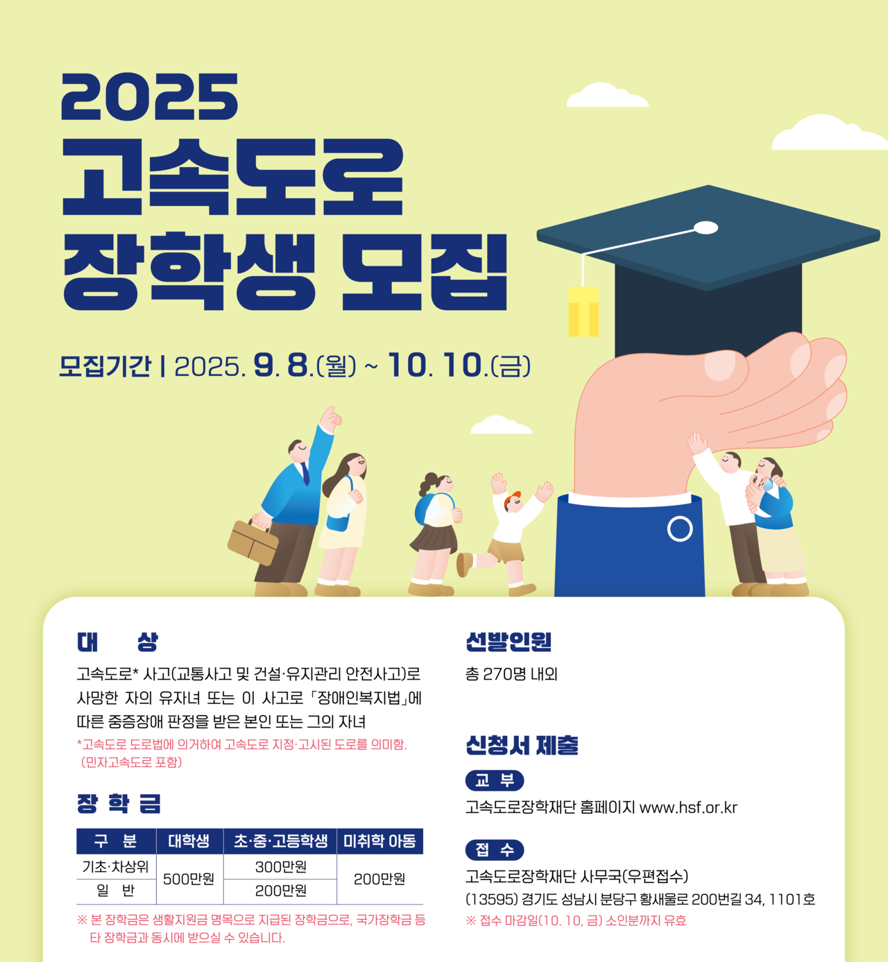 [헤럴드경제=신혜원 기자] 한국도로공사와 고속도로장학재단은 고속도로 사고 피해가정 자녀를 대상으로 9월 8일부터 10월 10일까지 2025년 고속도로 장학생을 모집한다고 5일 밝혔다.