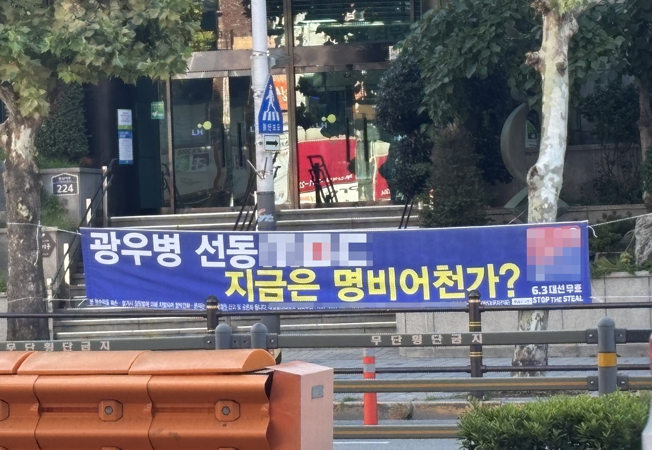 | 부산역 인근 모처에 붙은 모 언론사를 비방하는 현수막. 부산시는 부산역을 비롯한 주요 관광지, 교차로, 관문 지역을 대상으로 ‘현수막 없는 청정 거리’를 운영한다. 홍윤 기자 |