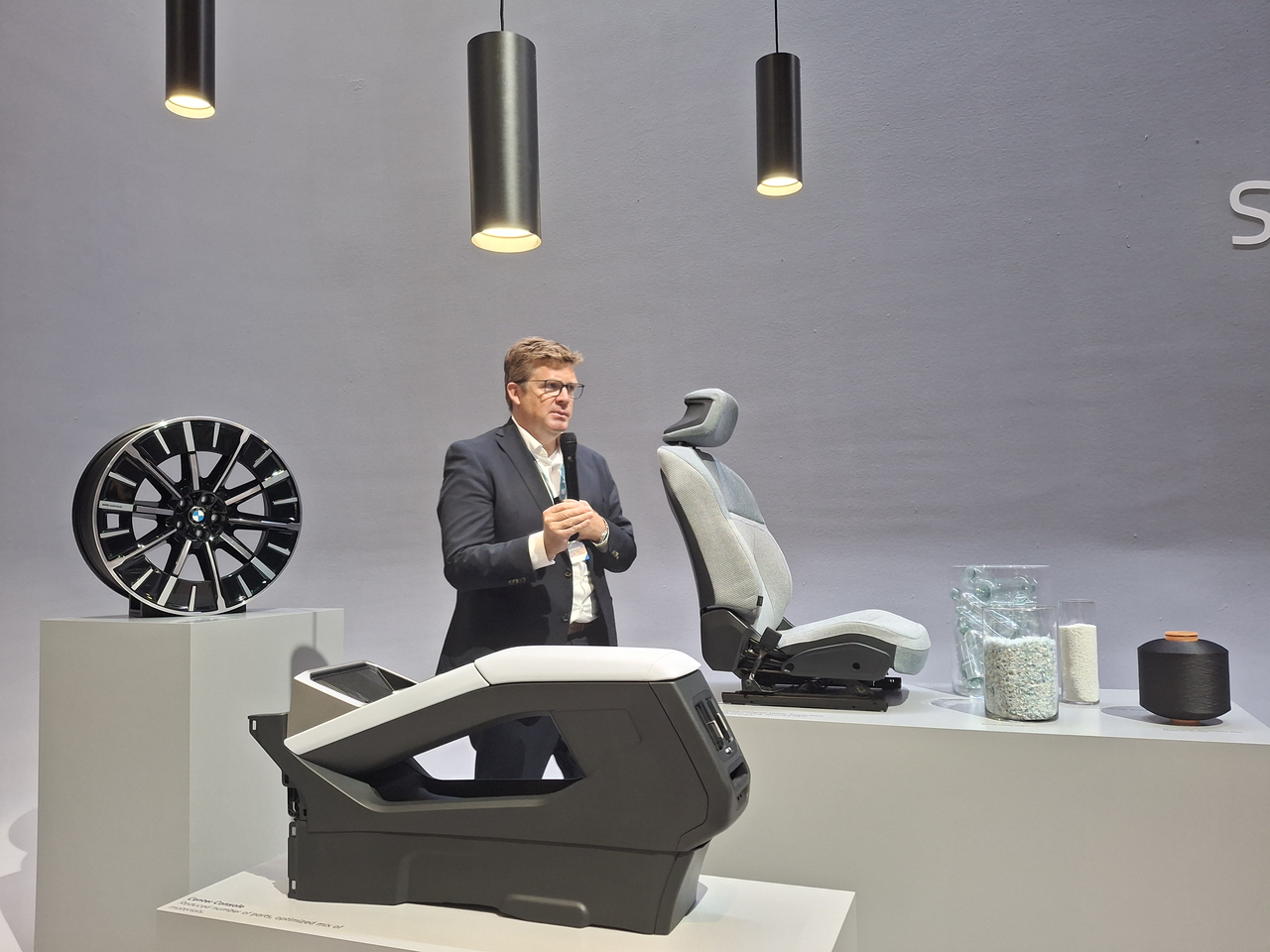 | 위르겐 프로에스키 BMW그룹 지속가능성 차량 프로젝트 총괄이 5일 열린 행사에서 BMW의 친환경 소재를 소개하고 있다. [뮌헨=김성우 기자] |