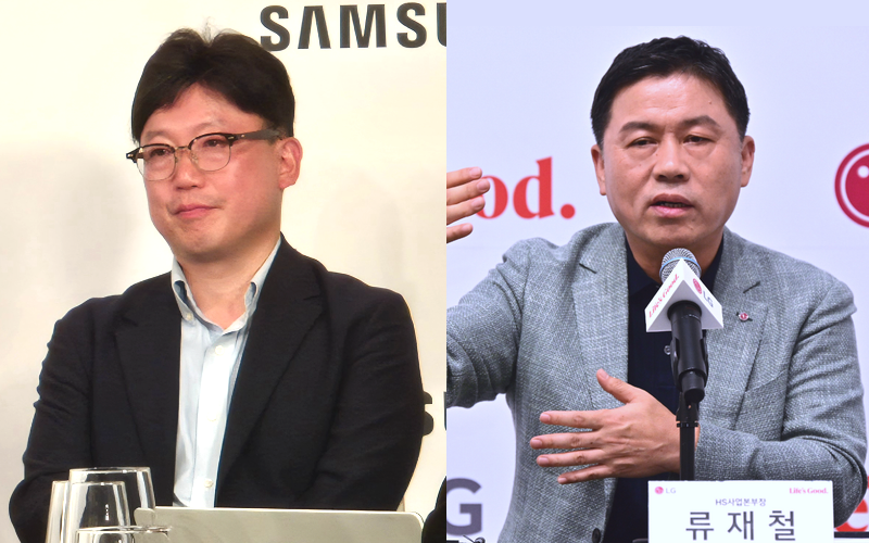 | 4일(현지시간) 독일 베를린에서 연달아 열린 IFA 2025 삼성전자·LG전자 기자간담회에 참석한 용석우(왼쪽) 삼성전자 VD사업부장과 류재철 LG전자 HS사업본부장. [김현일 기자·LG전자 제공] |