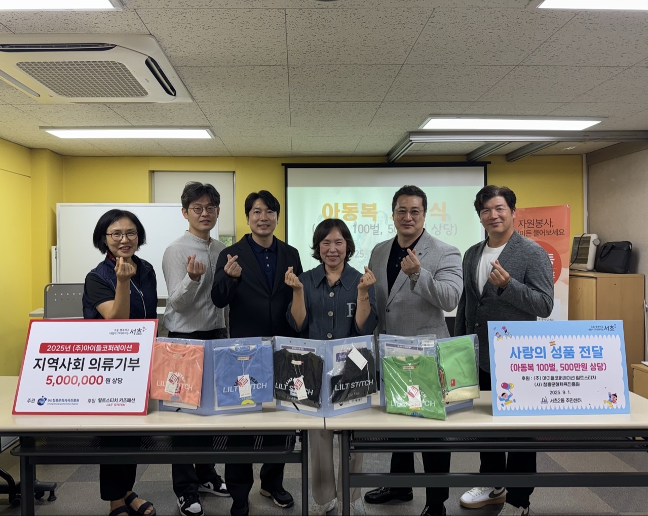 아이들코퍼레이션은 지역사회 아동을 위해 500만 원 상당의 아동복 약 64벌(남아·여아용)을 기부했다. 기부된 물품은 서초1·2동의 저소득층 아동가구에 우선 전달되며, 반포사회복지관 등 아동 관련 사회복지기관에도 배부될 예정이다.