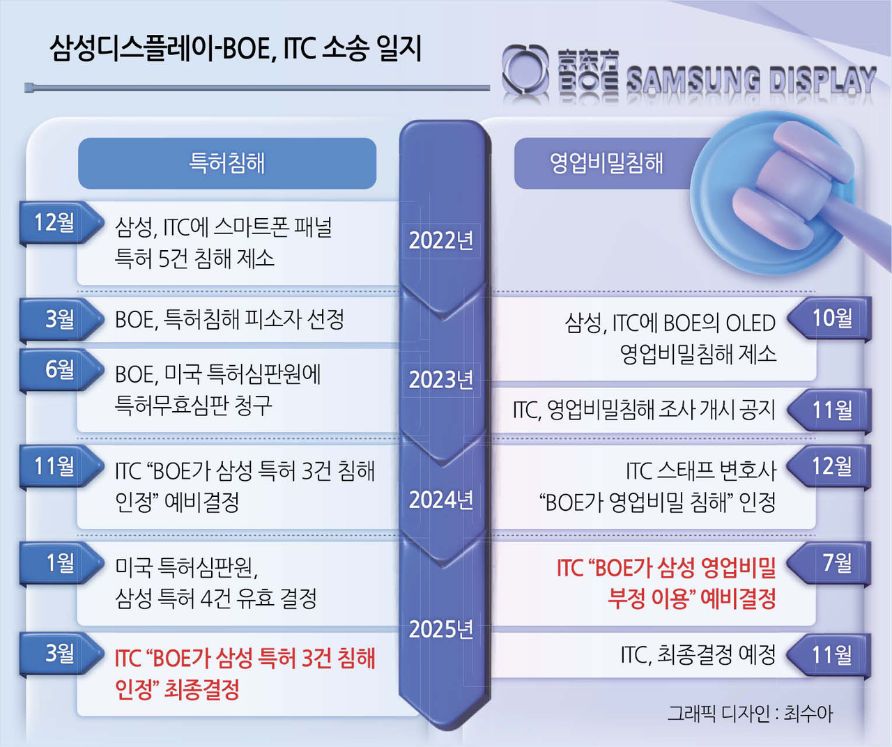 미국 국제무역위원회(ITC)는 7월 예비결정을 통해 중국 BOE 및 7개 자회사가 삼성디스플레이의 OLED 영업비밀을 침해했다고 인정하면서 14년 8개월 동안 BOE의 OLED 패널을 미국으로 수입하지 못하도록 했다.
