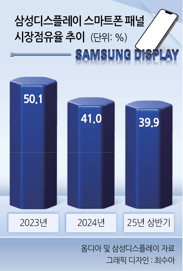 같은 기간 삼성디스플레이의 점유율은 52.9%에서 46.4%로 떨어졌다. 해를 거듭할수록 OLED 패널을 탑재하는 스마트폰이 늘어나고 있지만 그 수혜는 고스란히 중국 디스플레이 업체들이 가져가고 있는 셈이다.
