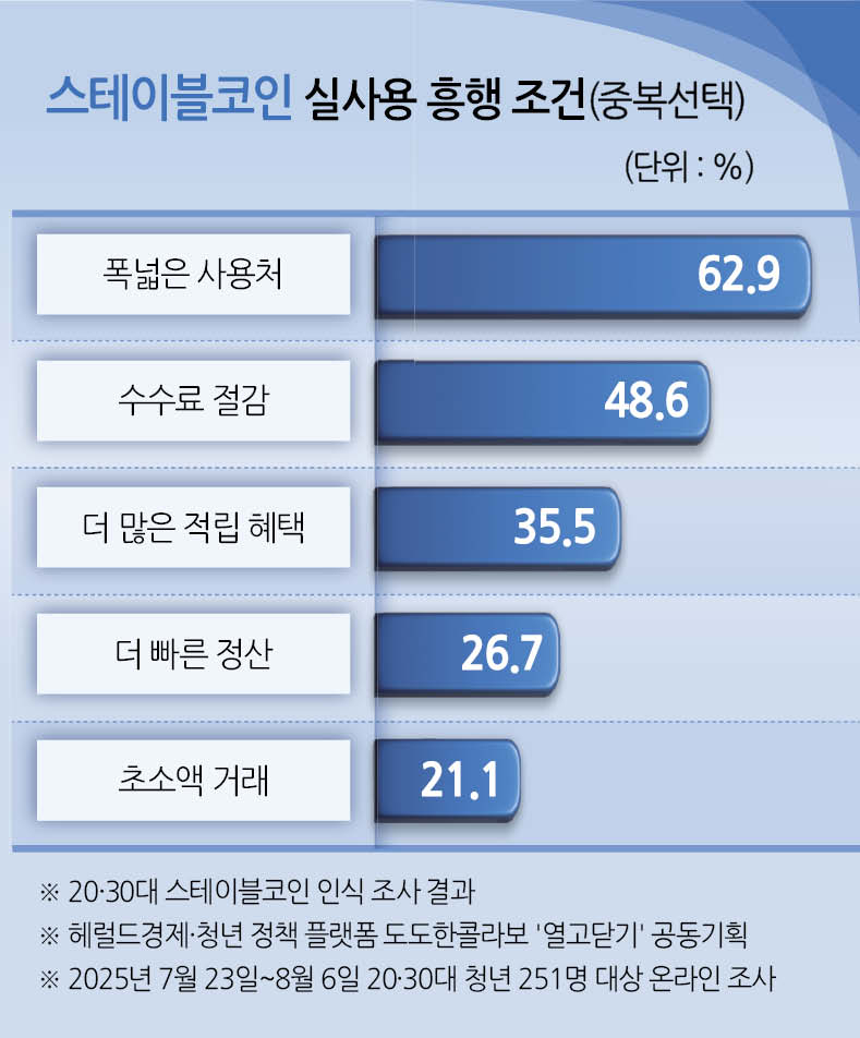 본지의 스테이블코인 인식조사에서 전체 응답자의 62.9%가 ‘폭넓은 사용처 확보’를 결제수단으로서 가장 중요한 조건으로 꼽았다. 수수료 절감(48.6%), 적립 혜택(35.5%), 빠른 정산(26.7%), 초소액 거래 가능(21.1%) 등이 뒤를 이었다. 아무리 혁신적인 결제 수단이더라도 일상적인 활용이 가능해야 쓰겠다는 것이다.