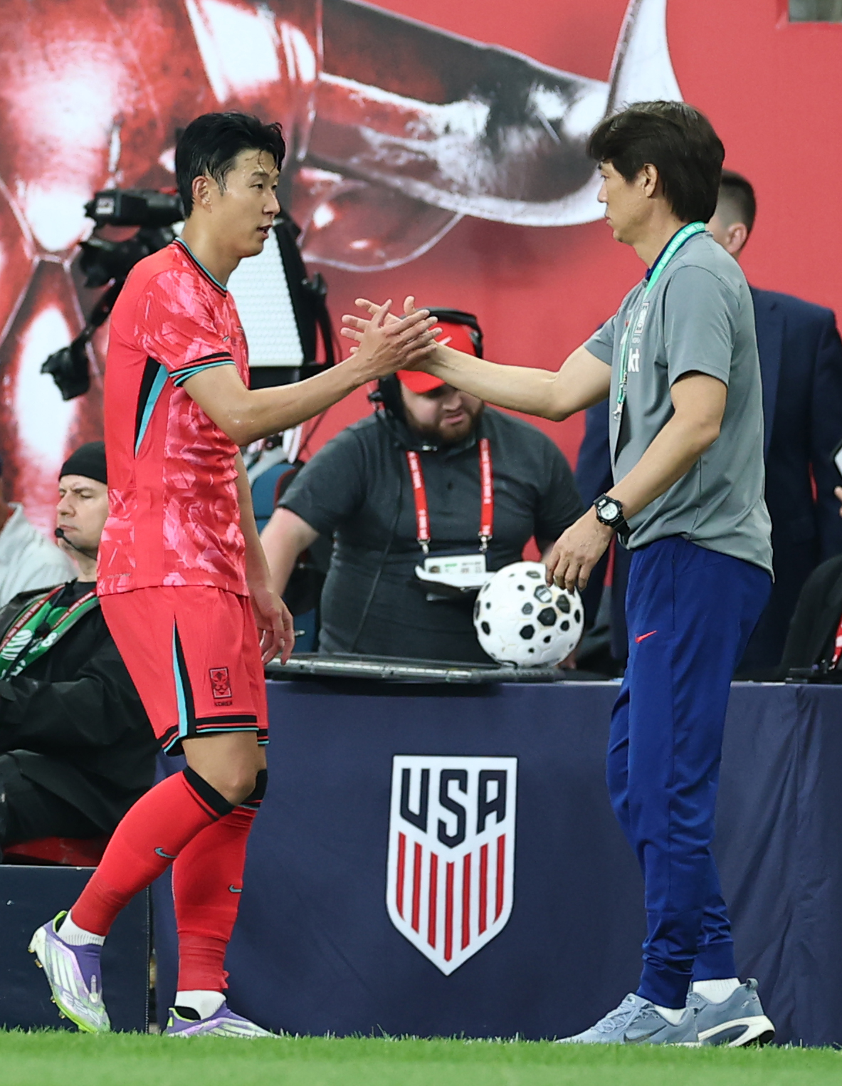 | 손흥민이 미국과 친선경기에서 후반 교체되면서 홍명보 감독과 손을 맞잡고 있다. [연합] |