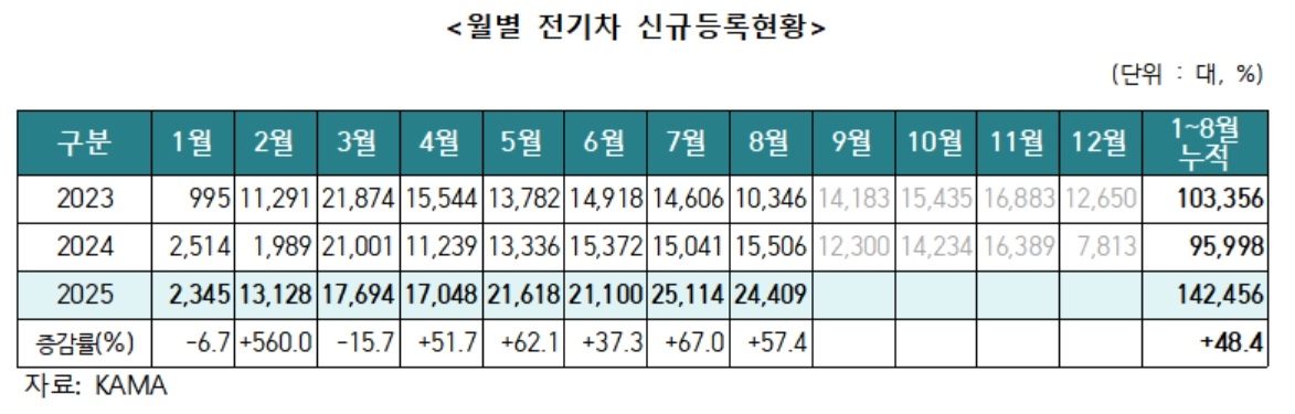 8일 한국자동차모빌리티산업협회(KAMA)가 발표한 ‘2025년 1~8월 국내 전기차 시장 동향’ 자료에 따르면, 지난달 국내 전기차 판매는 지난 4월 이후 5개월 연속 전년 동월 대비 증가세를 유지했다.