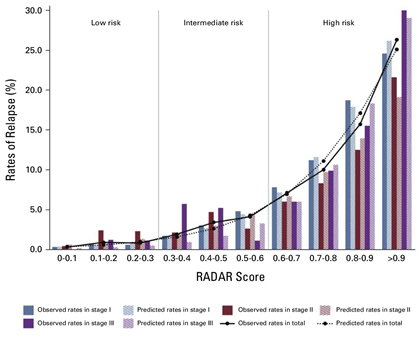 실제로 1~3기 병기와 관련 없이 저위험군에 비하여 중간위험군은 재발이나 사망 위험이 3.59배, 고위험군은 9.67배 높았다. 또 같은 병기 내에서도 고위험군은 저위험군에 비하여 1기는 5.83배, 2기 1.75배, 3기 1.84배 재발 및 사망 위험이 커졌다.