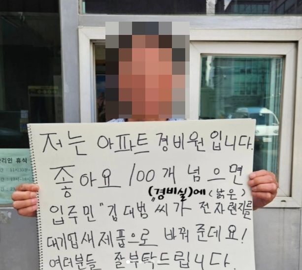 사진 속에는 한 경비원이 “저는 아파트 경비원입니다. 좋아요 100개 넘으면 입주민 김대범씨가 전자레인지를 대기업 새 제품으로 바꿔준대요. 여러분 잘 부탁드립니다”라고 손글씨로 적은 스케치북을 들고 환하게 웃고 있다.