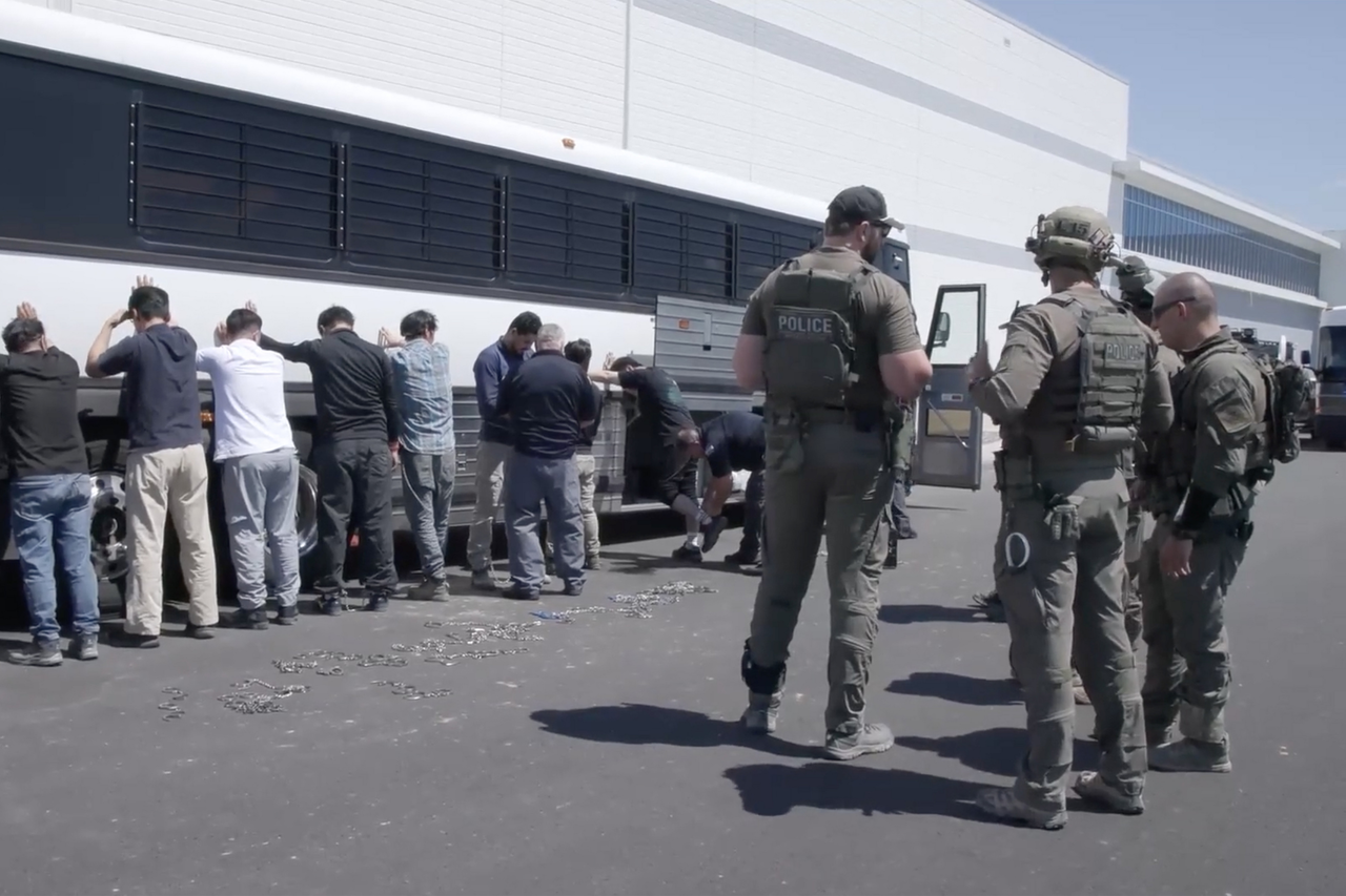 | 4일(현지시간) 조지아주 엘라벨 현대차그룹 전기차 공장에서 연방 수색영장을 집행하는 미국 이민세관단속국 요원들의 모습. [미국 이민세관단속국/UPI] |