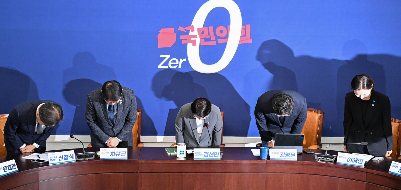 | 김선민(가운데) 조국혁신당 대표 권한대행을 비록한 지도부가 5일 오전 서울 여의도 국회에서 열린 현안 관련 기자간담회에서 당내 성비위 사건과 관련한 입장을 밝히며 고개숙여 사과하고 있다. 임세준 기자 |