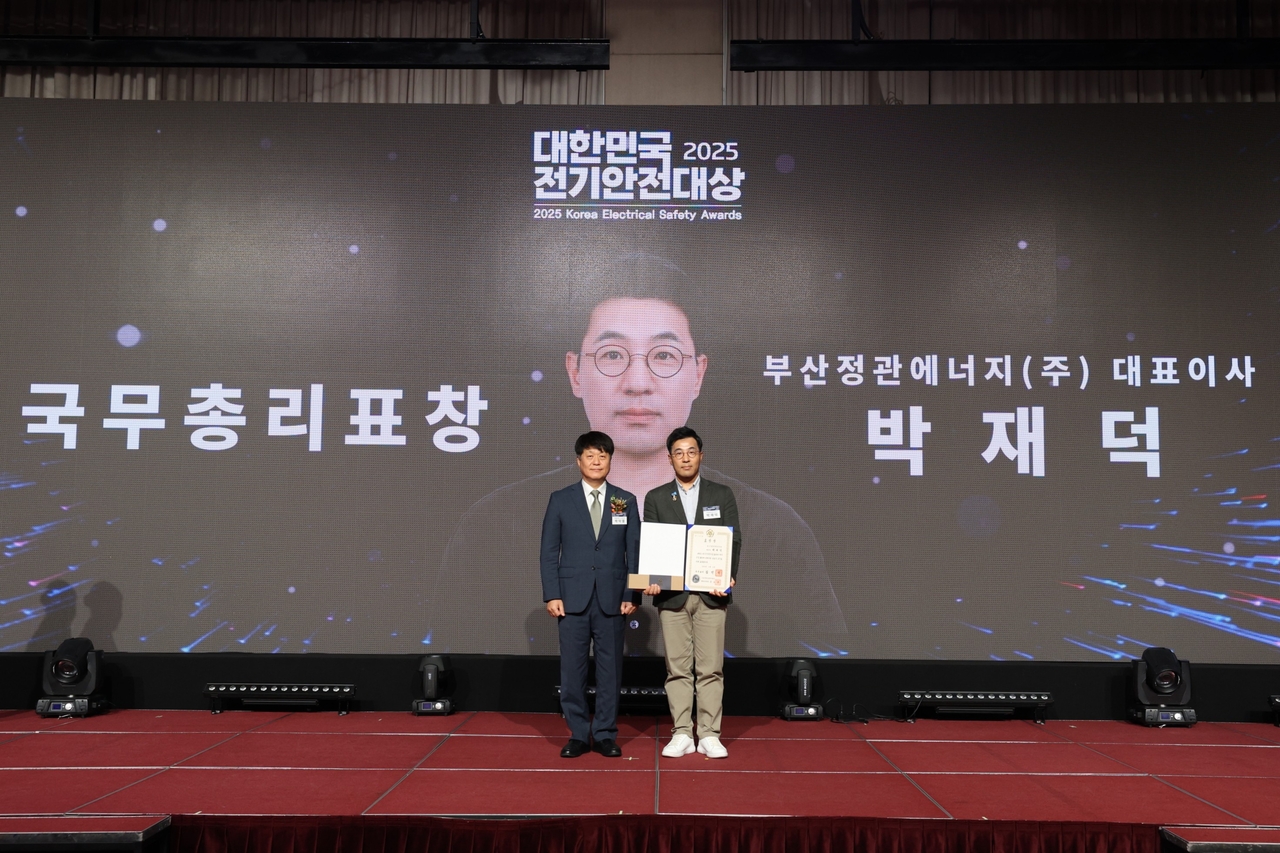 | 박재덕(오른쪽) 부산정관에너지 대표가 8일 서울 광진구 세종대 컨벤션센터에서 열린 ‘2025 대한민국 전기안전대상’에서 전기안전관리 유공 국무총리 표창을 수상하고 있다. [부산정관에너지 제공] |