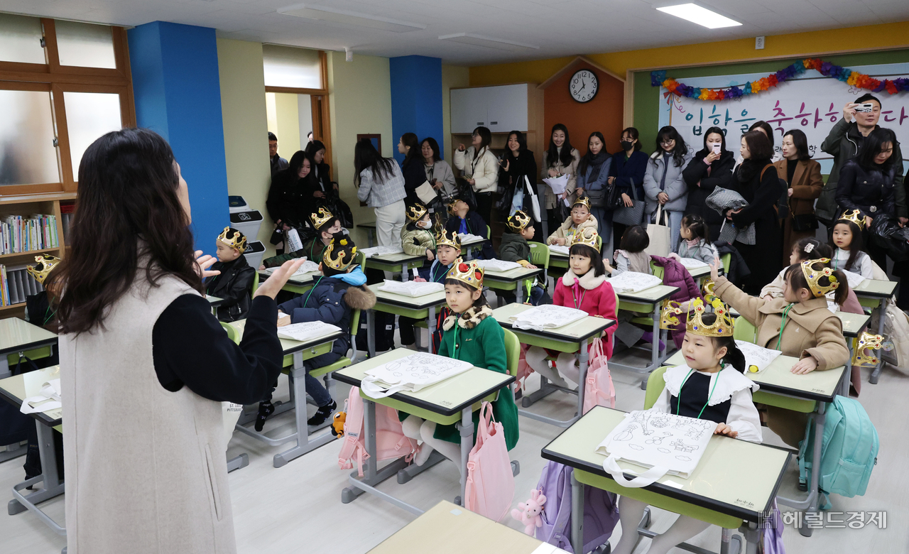 | 대한민국 초임 교사 연봉이 3524만원으로 경제협력개발기구(OECD) 국가 평균보다 낮다는 결과가 나왔다. 사진은 서울 영등포구 문래초등학교에서 1학년 신입생과 학부모들이 담임 선생님과 인사하고 있는 모습. 임세준 기자 |