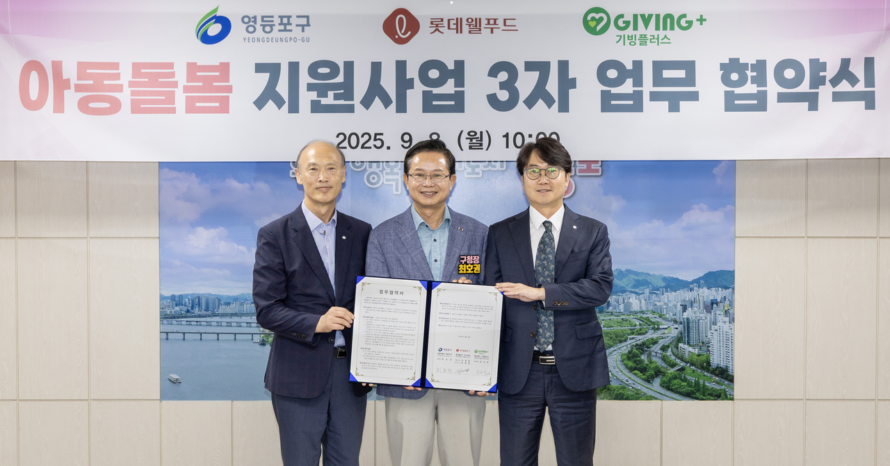 이번 협약식에는 최호권 영등포구청장과 위세량 롯데웰푸드 상무, 남궁규 재단법인 기빙플러스 상임대표가 참석해 아동 돌봄을 위한 민관 협력의 뜻을 모았다.