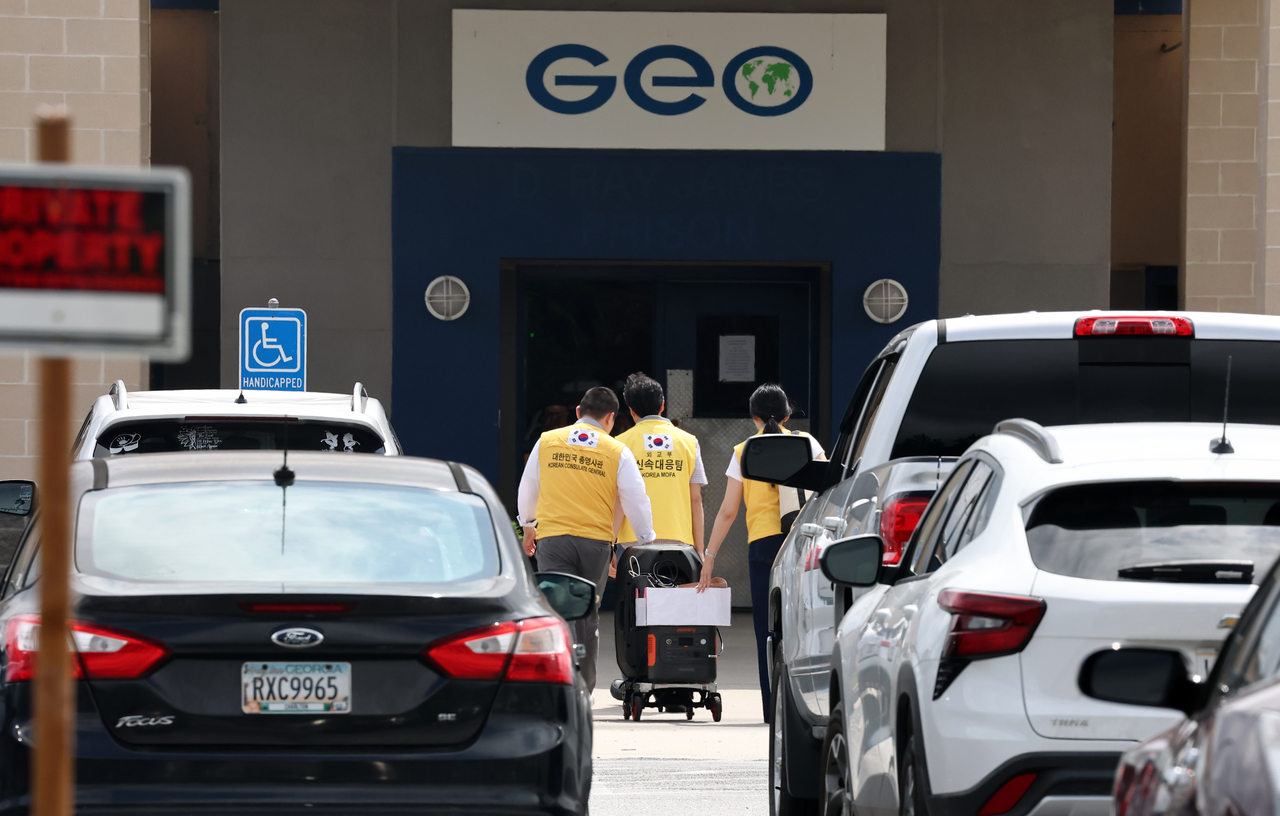 | 외교부 신속대응팀, 총영사관 관계자들이 8일(현지시간) 미국 당국의 이민단속으로 체포된 현대차-LG엔솔 배터리공장 건설 현장 직원들이 수감돼 있는 조지아주 포크스턴의 이민세관단속국(ICE) 구금시설로 향하고 있다. [연합] |