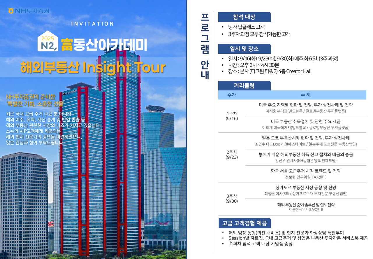 NH투자증권은 참가 고객에게 해외 임장 동행, 현지 전문가 화상 상담 특전, 세션별 자료집을 제공한다. 전 과정 참석 고객에게는 특별 기념품도 증정할 예정이다.