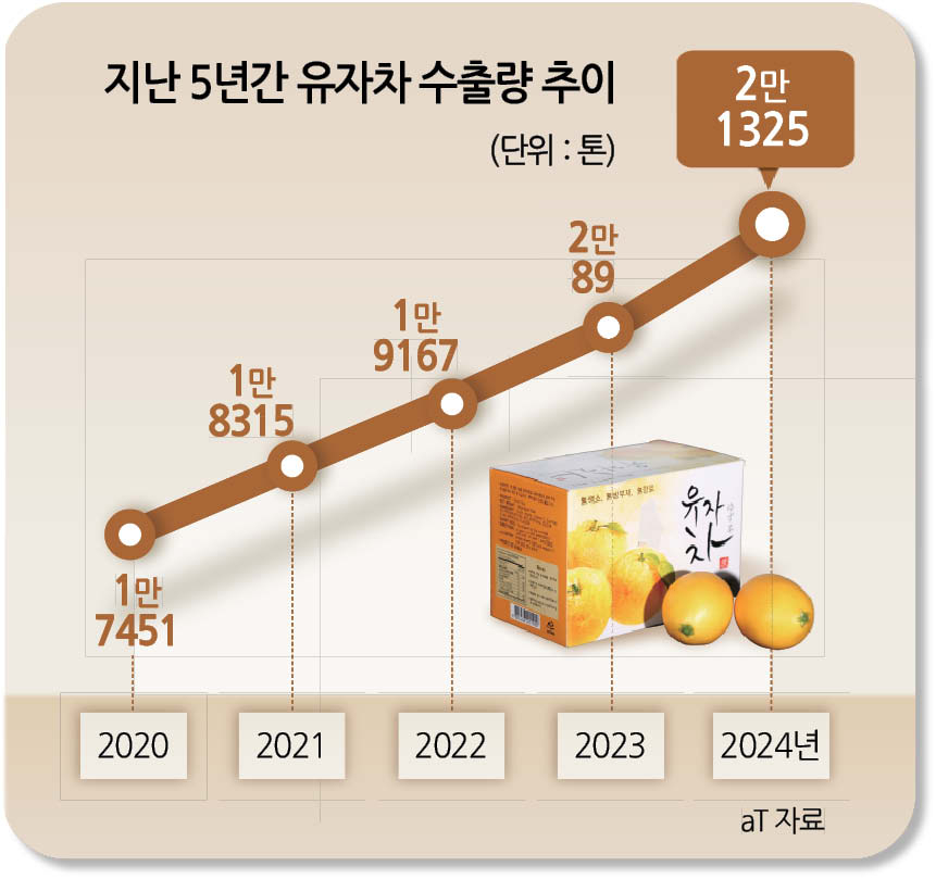 유자차는 K-푸드 열풍 전부터 해외에서 인기 품목이었다. 한국농수산식품유통공사(aT)에 따르면 유자차 수출량은 2021년 1만8315톤에서 2022년 1만9167톤, 2024년 2만1325톤으로 증가했다.