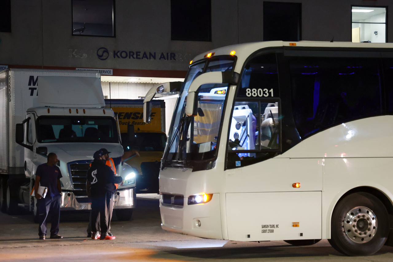 | 미국 이민당국에 의해 체포·구금됐다 풀려난 한국인 근로자들이 탑승한 버스가 11일(현지시간) 미국 조지아주 하츠필드-잭슨 애틀랜타 국제공항에 도착해 대한항공 전세기 옆에서 대기하고 있다. [연합] |