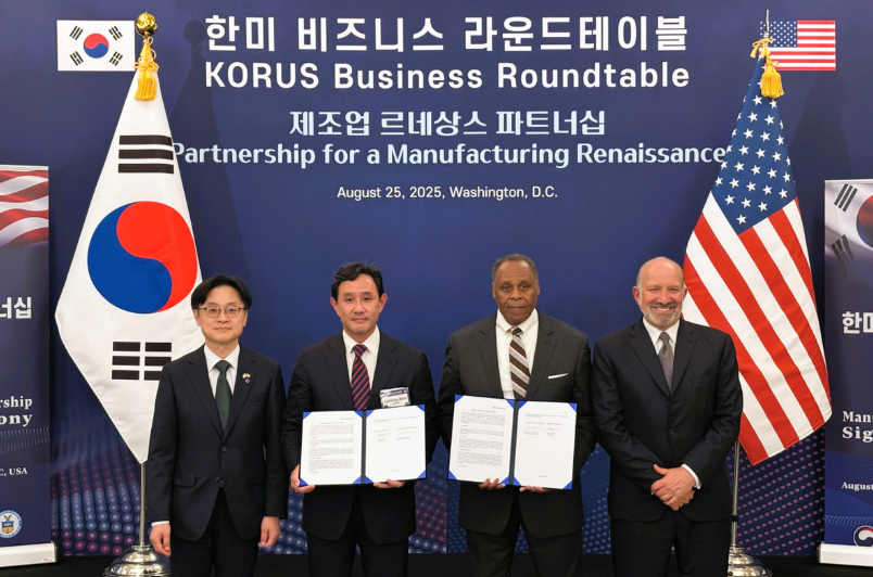 | 김정관(왼쪽부터) 산업통상자원부 장관, 최윤범 고려아연 회장, 마이클 윌리엄슨 록히드마틴 인터내셔널 사장, 하워드 러트닉 미국 상무부 장관이 지난달 25일(현지시간) ‘게르마늄 공급·구매와 핵심광물 공급망 협력을 위한 양해각서(MOU)’ 체결식에서 기념 촬영을 하고 있다. [고려아연 제공] |