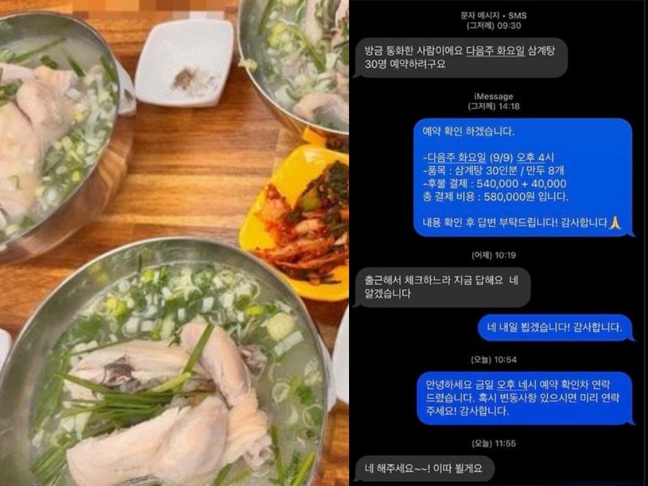 문자 내용을 보면 지난 7일 A씨는 삼계탕 30인분과 만두 8개를 예약하고 싶다는 B씨의 전화를 받고 문자로 예약을 확정 지었다.