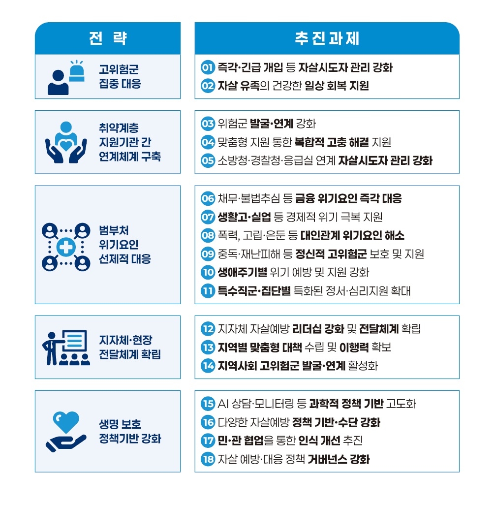 채무, 불법추심, 생활고, 학교 폭력, 직장 내 갑질, 가족문제, 범죄·재난피해, 중독 등 정신적 위기를 초래하는 복합적·다중적 요인을 해소하기 위해 범부처 정책 수단도 가동된다.