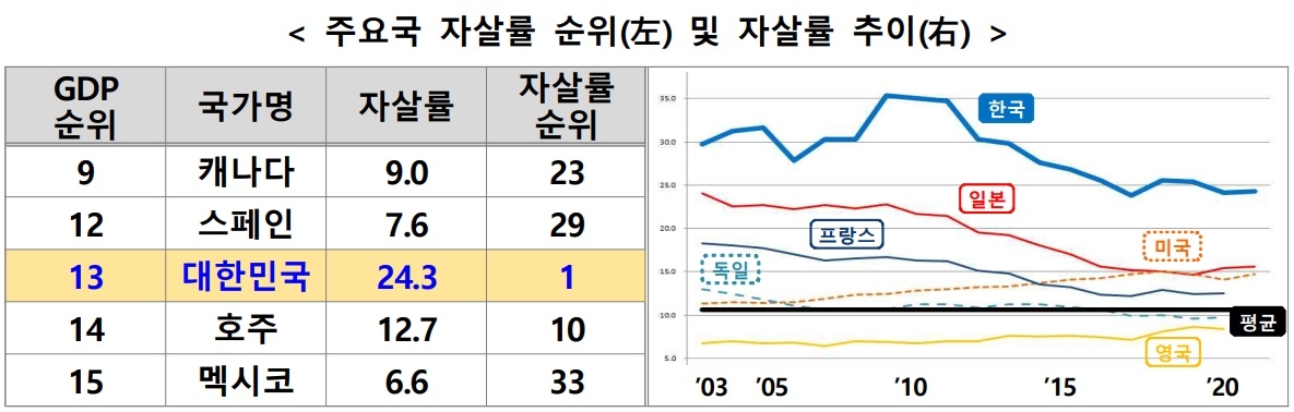 | [출처 : (GDP) 2025년 4월 IMF, (자살률) 2025년 2월 OECD, 표준인구당 자살률 기준] |