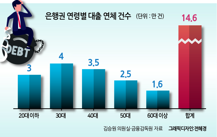 13일 헤럴드경제가 국회 정무위원회 소속 김승원 더불어민주당 의원실을 통해 금융감독원으로부터 받은 자료에 따르면 6월 말 기준 5대 은행과 인터넷전문은행의 2030세대 대출 연체 건수는 총 7만 건에 달했다. 총 대출 연체 건수(14만6000건)의 절반 수준이다. 30대만 4만 건으로 모든 나잇대에서 연체 건수가 가장 많았다. 그 뒤로 40대(3만5000건), 20대 미만(3만 건), 50대(2만5000건), 60대(1만6000건) 등 순이다.