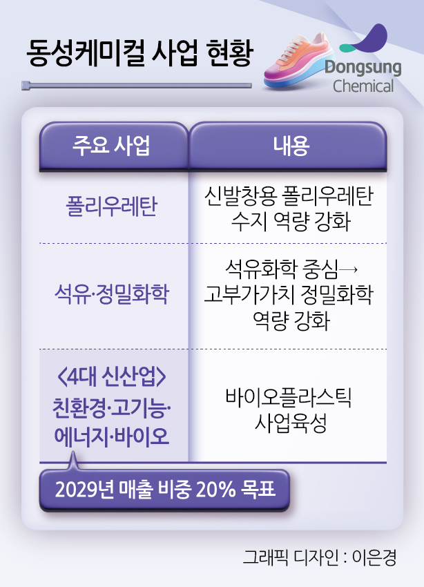 동성케미컬은 폴리우레탄 소재를 주력 제품으로 삼아온 회사다. 주력 제품인 신발창용 소재나 자회사 동성화인텍이 생산하는 액화천연가스(LNG)선박용 보냉재가 모두 폴리우레탄 소재로 만들어진다. 특히 나이키, 아디다스 등에 공급되는 신발창용 폴리우레탄이 매출 40%를 차지하며 안정적인 수익을 내고 있다.