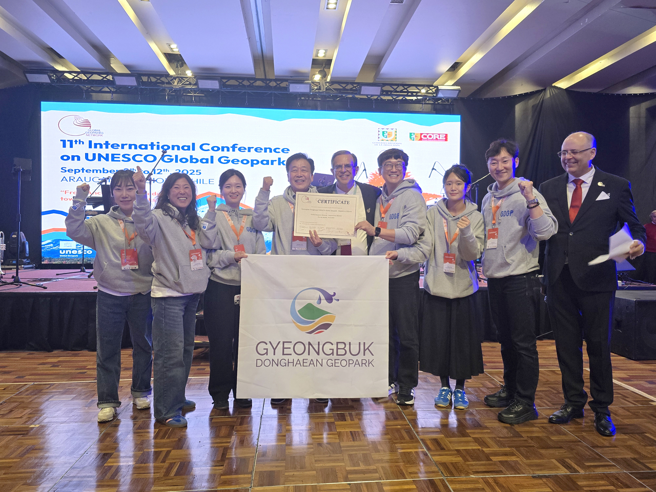 [헤럴드경제(영덕)=김병진 기자]경북 영덕군은 지난 8일부터 12일(현지 시각) 칠레 테무코에서 열린 제11회 세계지질공원네트워크(GGN) 총회에서 지역내 11개 지질명소가 포함된 경북동해안지질공원이 ‘유네스코 세계지질공원 정회원 인증서(Certificate of Membership)’를 받았다고 15일 밝혔다.