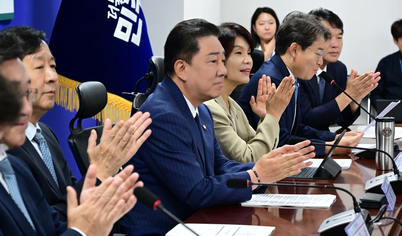 | 김병기 더불어민주당 원내대표가 15일 오전 서울 여의도 국회 의원회관에서 열린 추석 민생안정대책 당정협의에 참석해 박수를 치고 있다. 이상섭 기자 |
