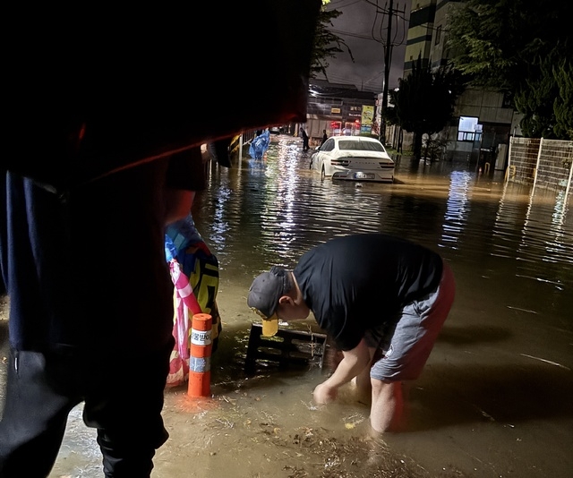 | 폭우가 쏟아진 7일, 군산시청 한 공무원이 하수구 정비를 하고 있다. [군산시] |