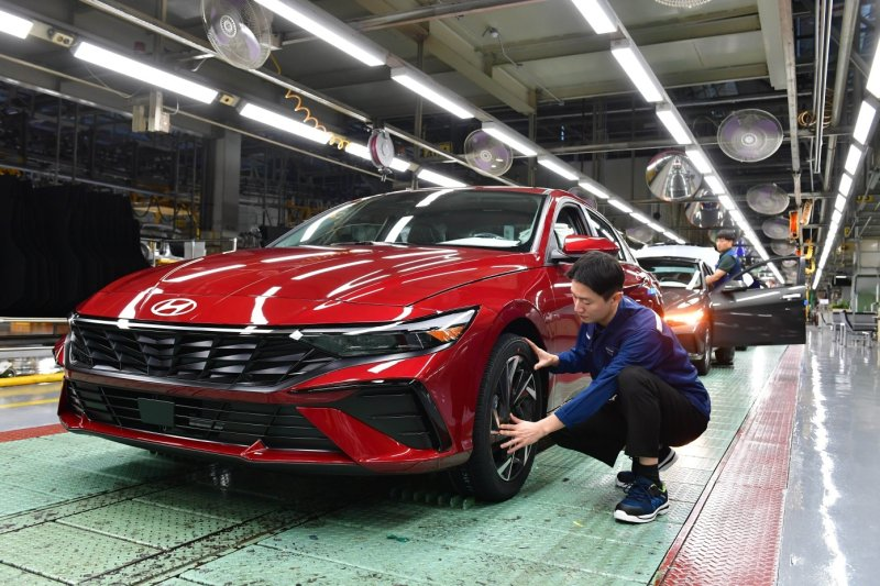 | 미국이 16일 일본 자동차에 대한 관세를 15%(2.5% 일반 관세 포함)로 인하하면서 한국산 자동차와 가격 역전 현상이 나타나고 있다. 사진은 현대자동차 울산공장 직원들이 아반떼 차량을 조립하고 있는 모습 [현대차 제공] |