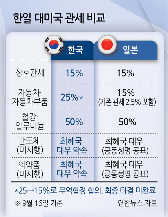 16일 업계와 외신에 따르면 미국 정부는 이날부터 일본산 자동차 관세를 기존 27.5%에서 15%로 낮춘 반면, 한국산 자동차는 7월 30일 타결된 한·미 관세 협상 이후 후속 절차 지연으로 25%의 관세를 유지하는 상황이다.