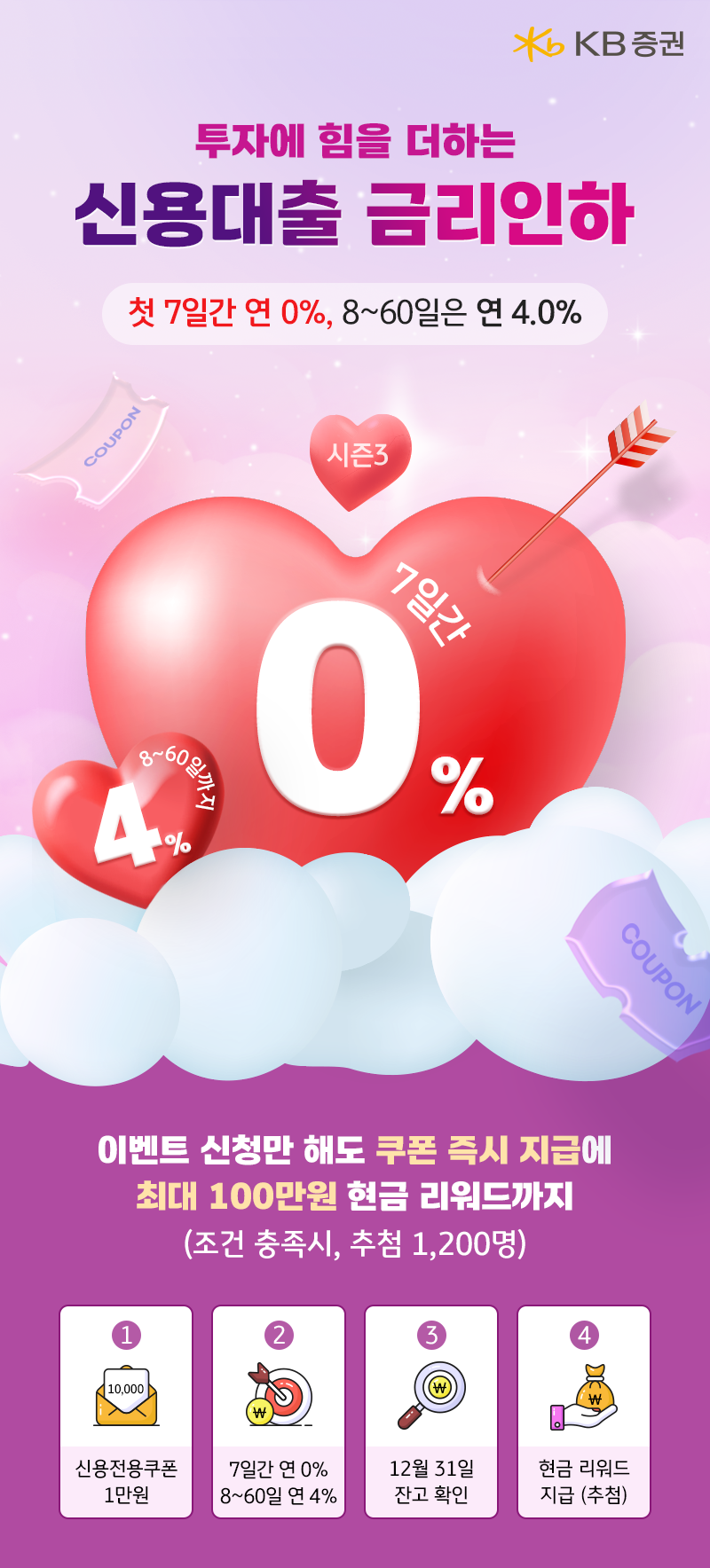 [헤럴드경제=경예은 기자] KB증권은 오는 12월12일까지 신용대출 신규 및 휴면 고객을 대상으로 ‘투자에 힘을 더하는 신용대출 금리인하 시즌3’ 이벤트를 실시한다고 17일 밝혔다.