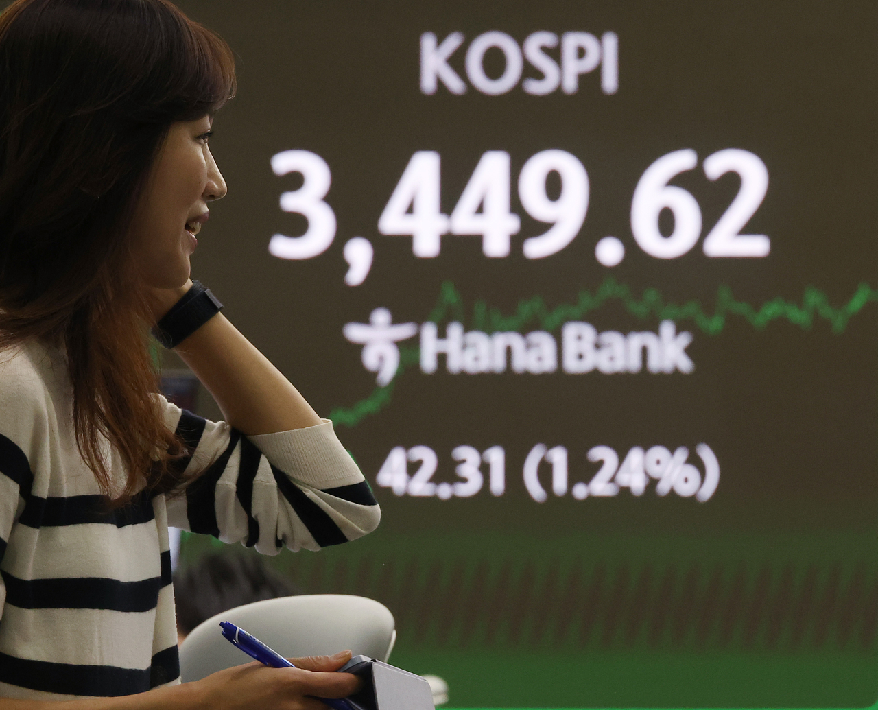 | 16일 서울 중구 하나은행 딜링룸 전광판에 코스피 종가가 표시돼 있다. 이날 코스피는 전날보다 42.31p(1.24%) 오른 3,449.62에 장을 마치며 5거래일 연속 사상 최고치를 경신했다. [연합] |