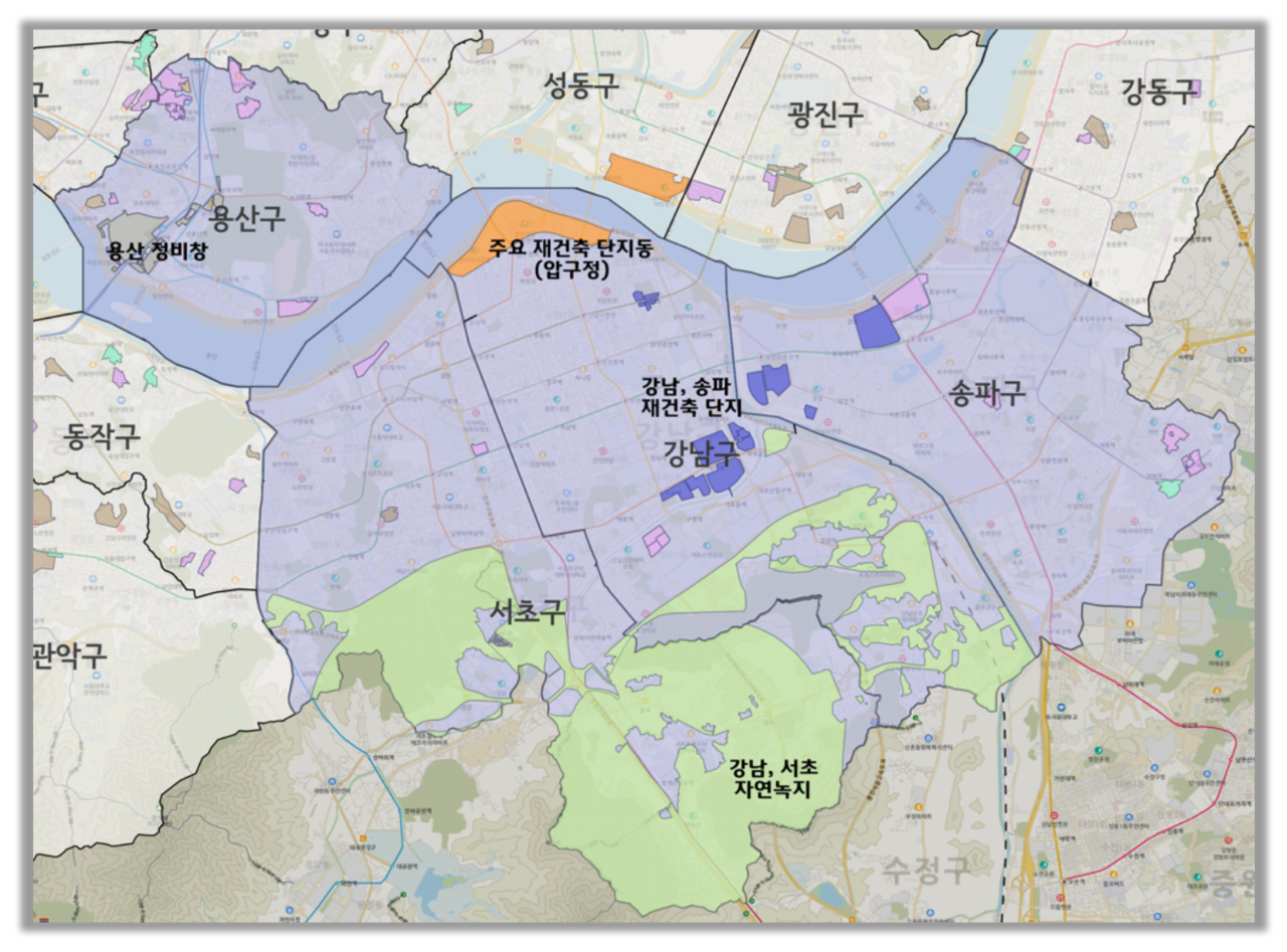 | 강남 3구, 용산구 토허구역 재지정 현황. [서울시] |
