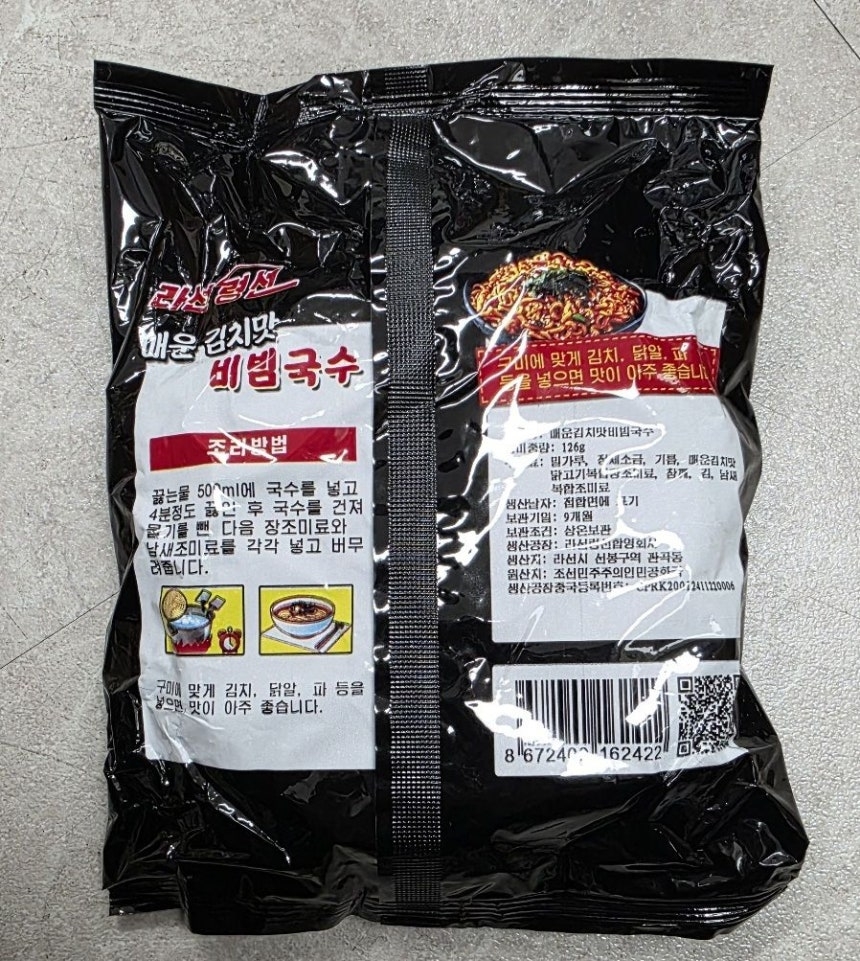| 북한에서 출시한 ‘매운 김치맛 비빔국수’의 표지 뒷면 모습. [강동완 전 동아대 교수 제공] |