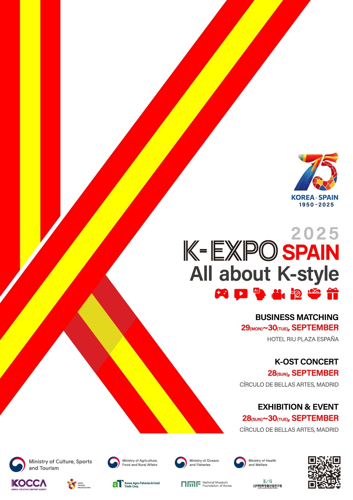 [헤럴드경제 = 서병기선임기자]문화체육관광부(장관 최휘영, 이하 문체부)와 한국콘텐츠진흥원(원장 직무대행 유현석, 이하 콘진원)은 우수 K-콘텐츠와 연관 산업 소비재·서비스 제품의 해외 동반 수출을 위한 범부처 합동 박람회 ‘2025 K-엑스포 : 올 어바웃 케이 스타일(K-EXPO : All about K-Style, 이하 K-엑스포)’을 오는 9월 28일부터 30일까지 스페인 마드리드에서 개최한다.