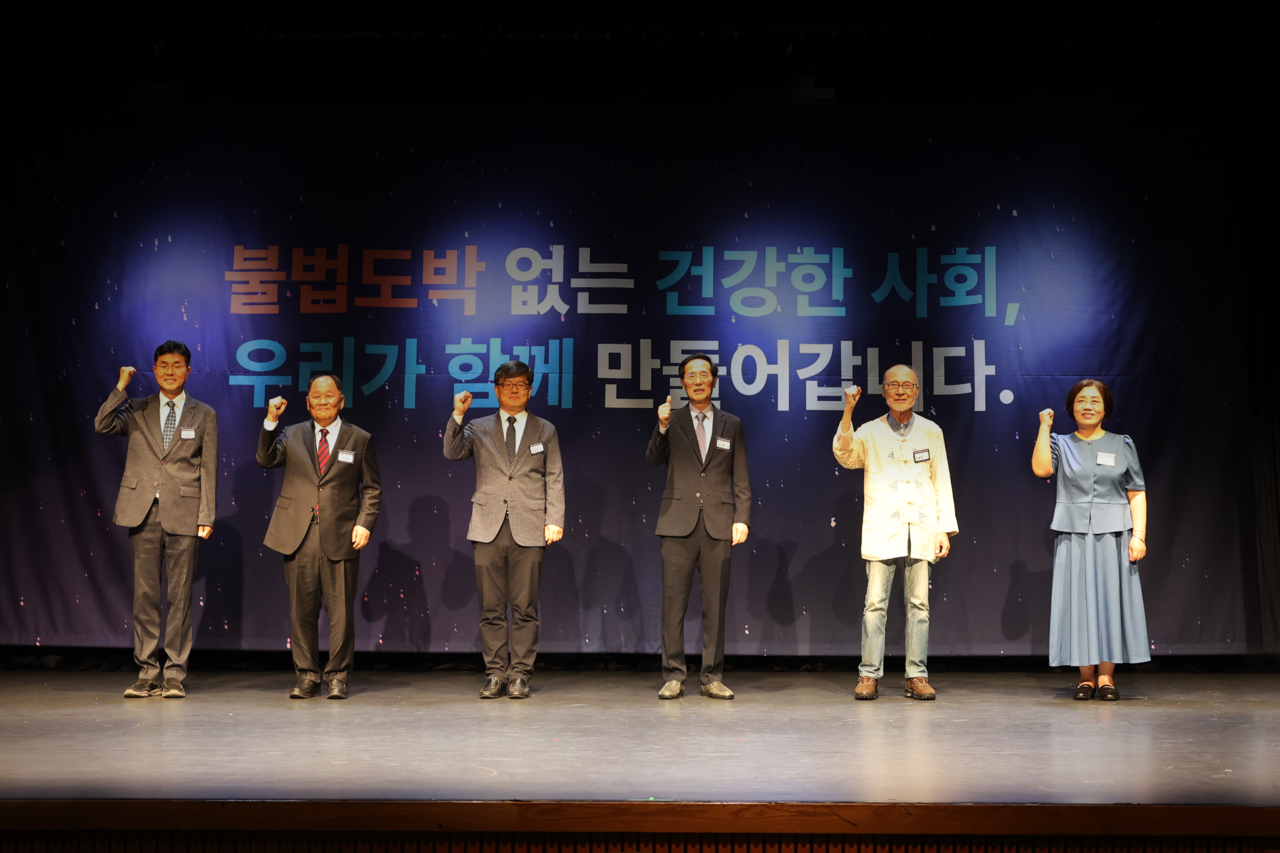 | 제17회 도박중독 추방의 날 기념식에서 세리머니가 진행되고 있다.(왼쪽부터 문체부 김근호 국장, 신양호 유공 수상자, 경찰청 임욱성 총경, 사행산업통합감독위원회 심오택 위원장, 도박중독 회복자 대표, 한국도박문제예방치유원 신미경 원장 |