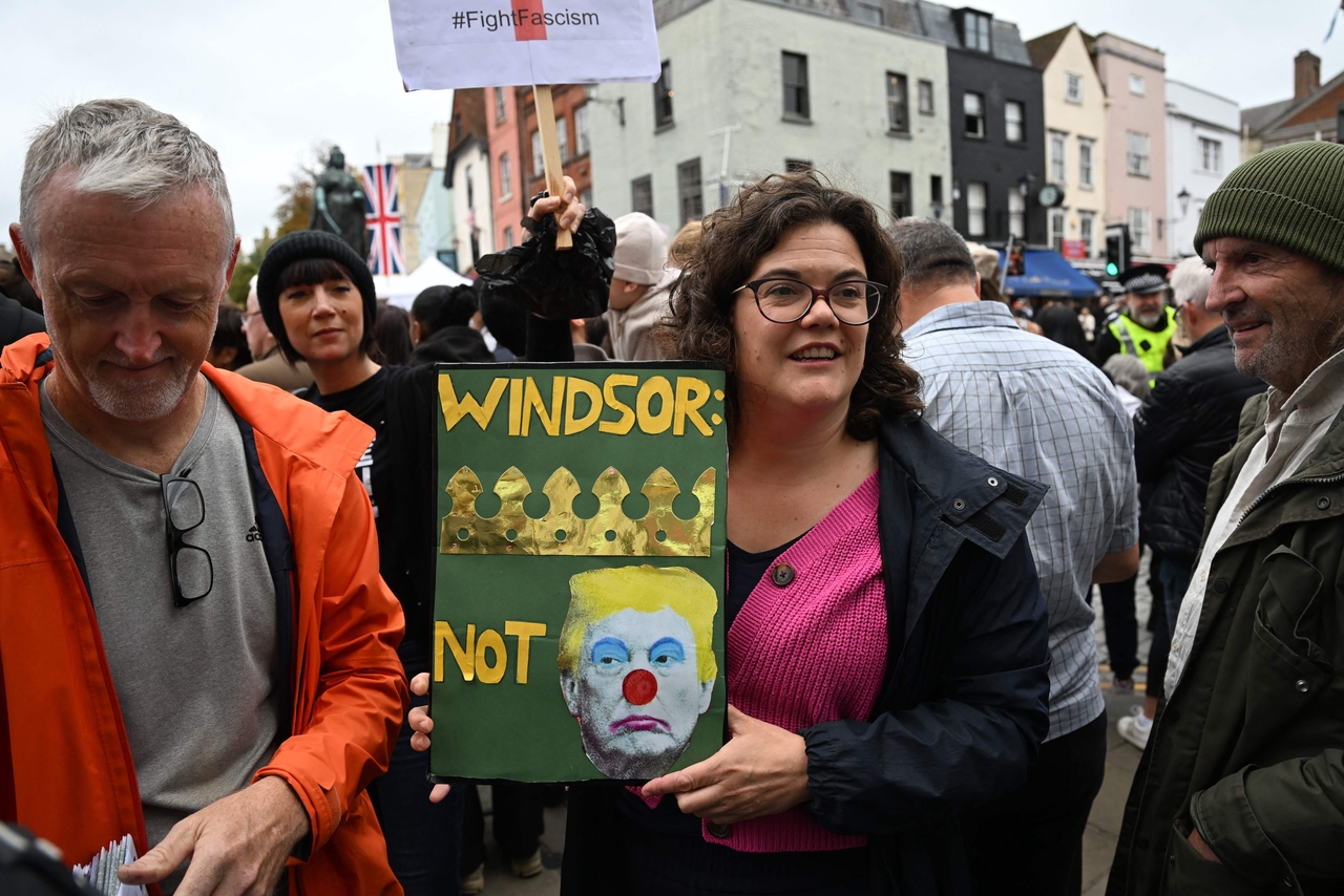 | 17일(현지시간) 윈저성 인근에 관광객들이 도널드 트럼프 미국 대통령의 국빈방문을 반대하는 시위가 벌어지고 있다. [AFP] |