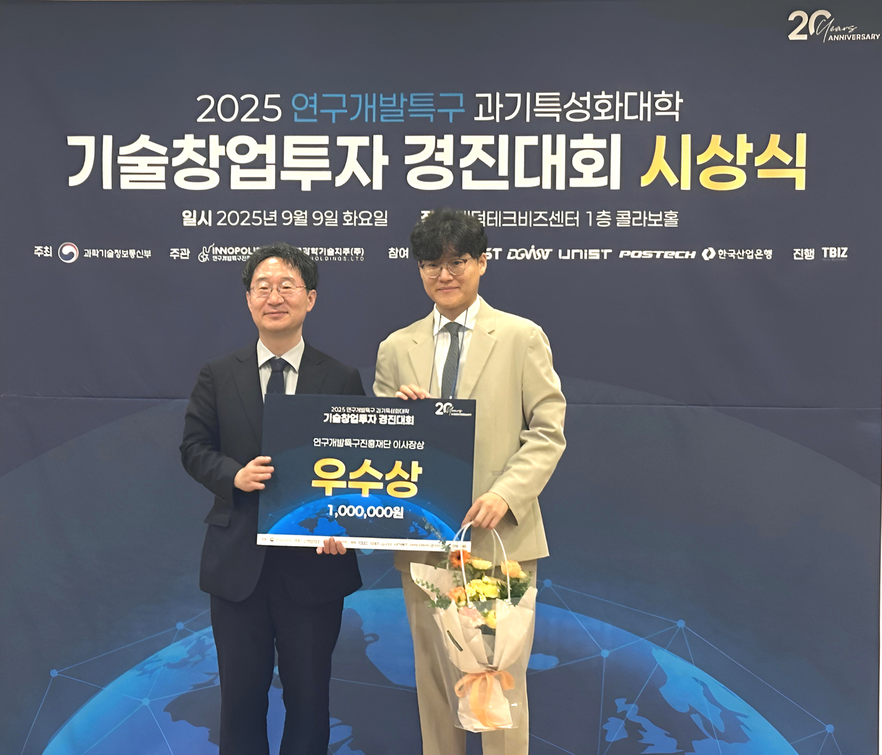 | 과기특성화대학 기술창업투자 경진대회서 우수상을 수상한 (주)엘엠엔틱바이텍 류동환(오른쪽) 대표와 정희권 연구개발특구진흥재단 이사장이 기념촬영을 하고 있다.[DGIST 제공] |