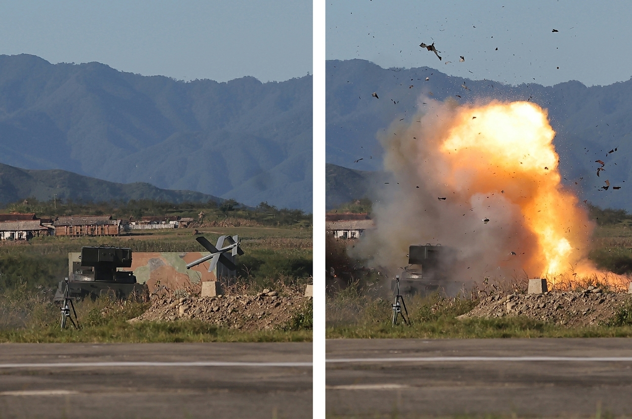 | 북한 노동신문은 19일 김정은 국무위원장이 전날 무인항공기술연합체 산하 연구소와 기업소를 방문해 무인 무장장비 성능시험을 지도했다고 보도했다. 엑스자형 날개를 장착한 북한판 란쳇 전술무인공격기가 목표를 타격하는 모습. [평양 노동신문=뉴스1] |