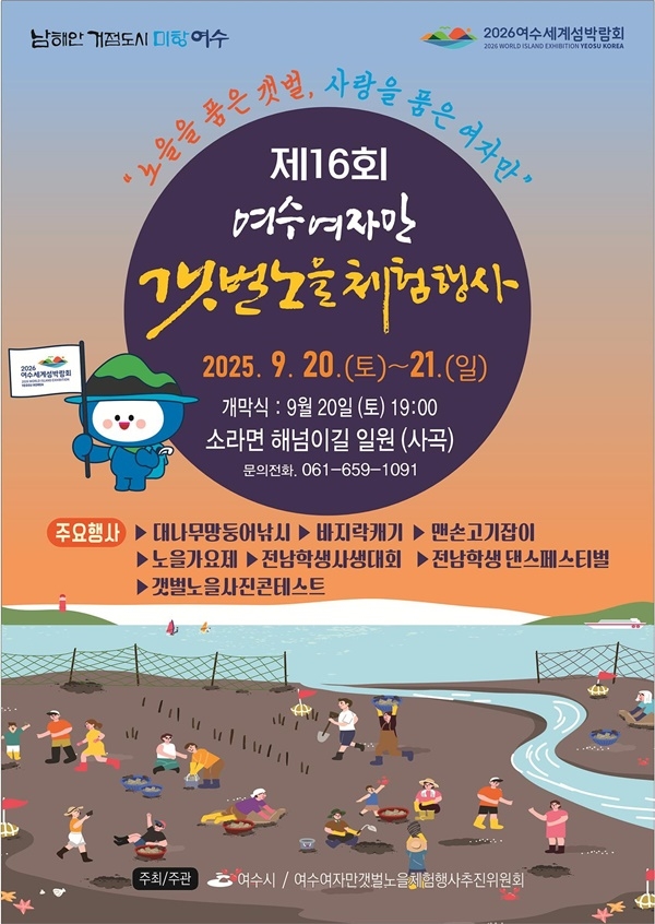 [헤럴드경제(여수)=박대성 기자] 여수시(시장 정기명)는 주말인 20~21일 이틀간 소라면 해넘이길 일원에서 ‘제16회 여수여자만갯벌노을체험행사’를 개최한다.